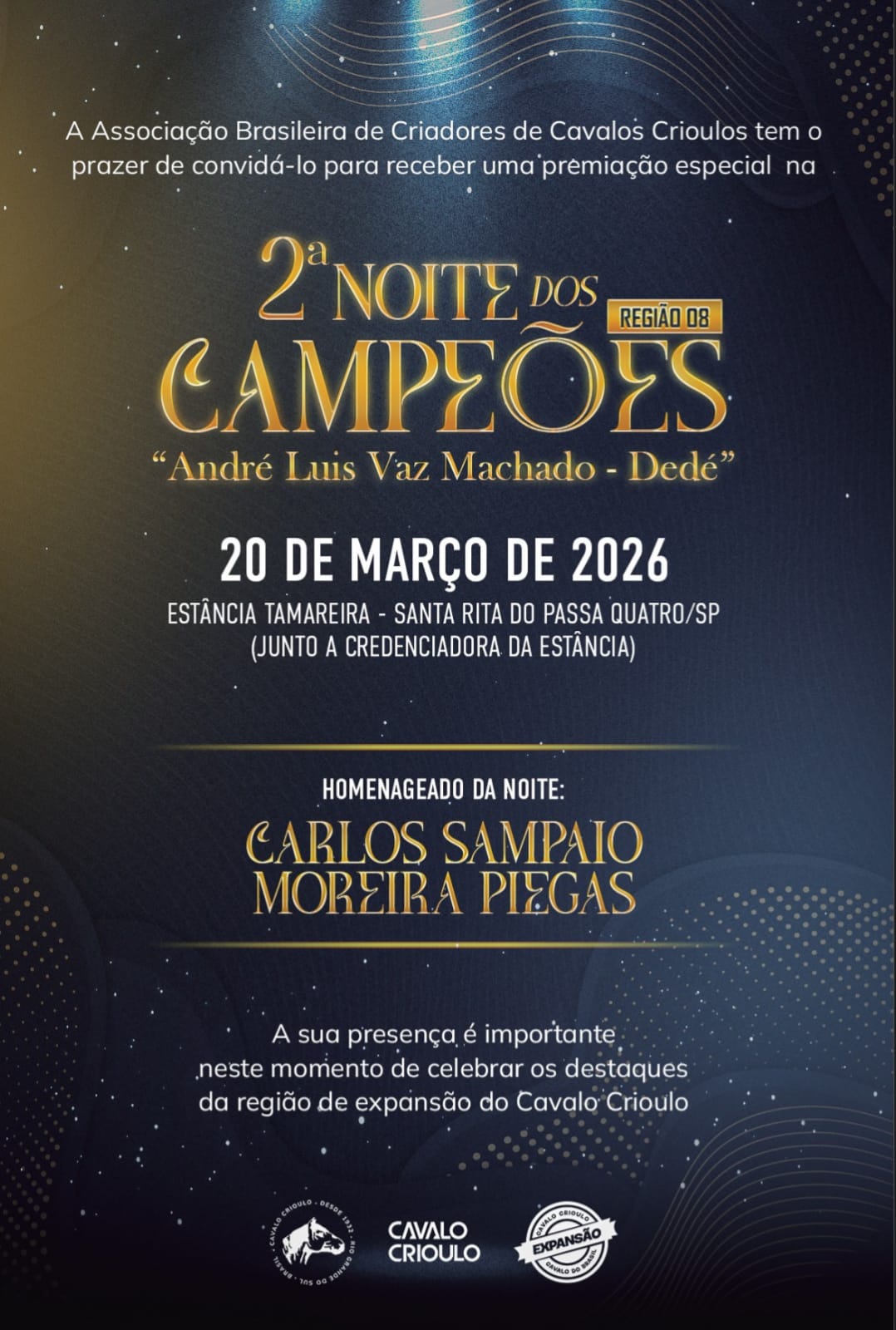 A segunda edição da Noite dos Campeões integra a programação da 10ª Credenciadora na Estância Tamareira, seletiva para provas tradicionais como Freio de Ouro, Doma, Freio do Proprietário e Morfologia.